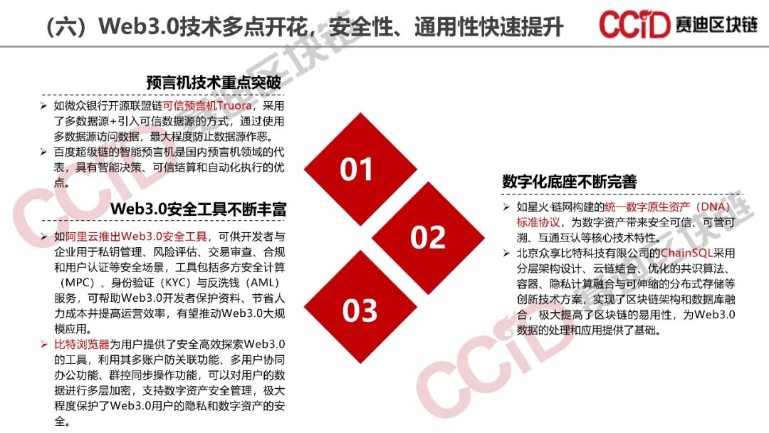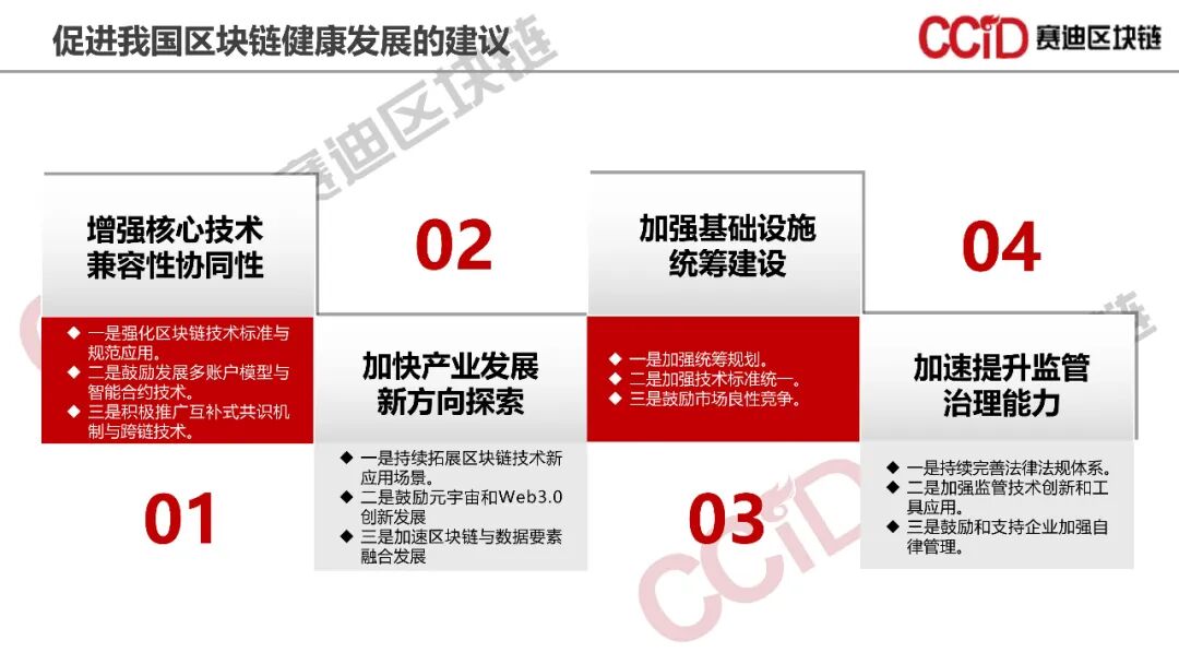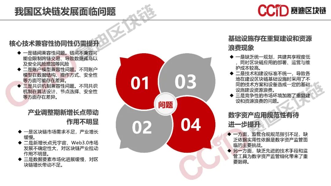 在数字经济助推新质生产力飞速发展的时代背景下,区块链作为打造数字经济的重要底座,面临着新的机遇和挑战。《报告》认为,区块链目前面临核心技术兼容性协同性不足、新增长点带动作用不明显、基础设施存在重复建设和浪费以及监管规范性有待提升等问题,亟需增强核心技术兼容性协同性,推进Web3.0、元宇宙和数字资产等新方向的探索和应用落地,提升基础设施统筹建设能力,同时加强监管治理,特别是数据资产管理的规范化和市场化治理,切实为培育和发展新质生产力贡献力量。