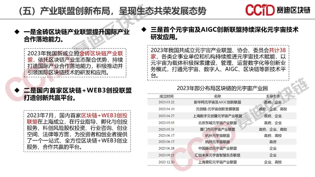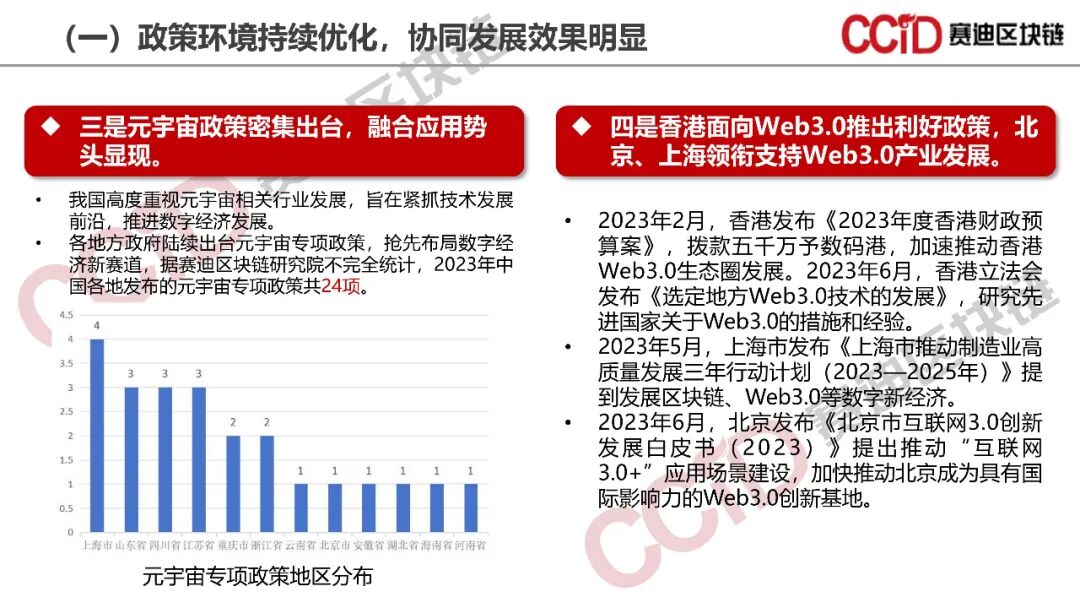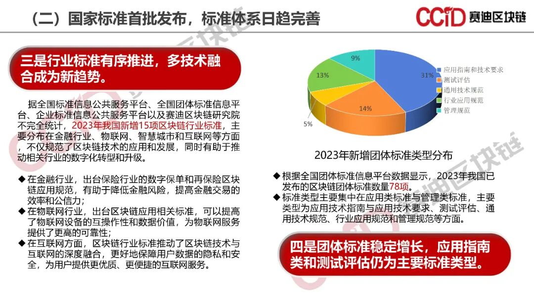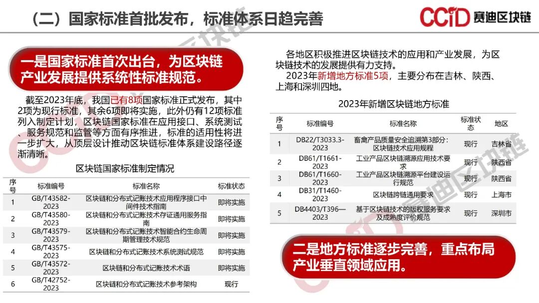 《报告》认为,2023年我国区块链产业逐步进入稳定和成熟阶段,区块链开始真正作为新一代基础设施发挥其实际效能。一是区块链政策环境持续优化,元宇宙和Web3.0领域持续推出利好政策,数字资产领域政策关注度大幅提升;二是区块链标准体系逐步完善,国家标准首次出台,地方标准不断补充完善,行业标准和团体标准有序推进,为区块链产业发展提供系统性标准规范;三是区块链通用性跨链技术创新突破,新型账户模型不断涌现,关键性能、安全和效率等稳步提升;四是区块链产业进入理性调整时期,区块链产业规模和投融资规模同比增速双放缓,产业向深层、广域和专业化方向演进;五是数据资产行业应用成为新一轮区块链应用热点,规模化应用深入发展,数据要素价值进一步释放。