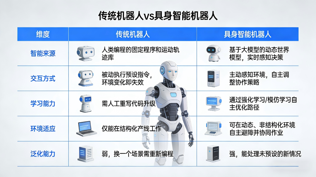很多人混淆"具身智能"和"传统机器人",是因为二者都有物理实体。但它们的智能生成机制完全不同 :